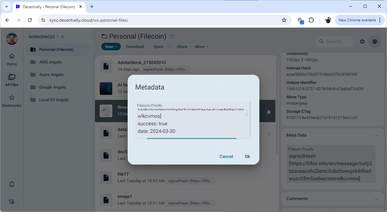 platform that emphasizes transparency and security in file storage using blockchain technology. Each file on the platform comes with an accessible layer of metadata that provides users with daily proof of their file’s integrity and existence on the Filecoin blockchain.