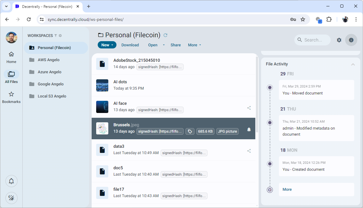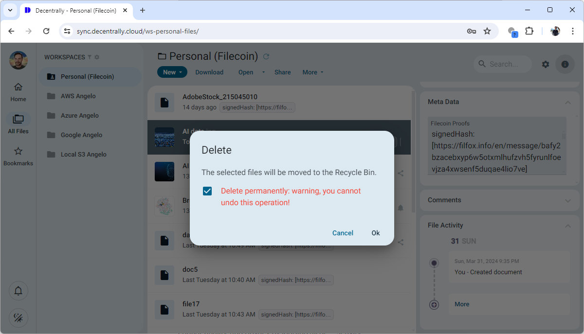 With Decentrally’s DataDrop, users can enjoy the simplicity of dragging and dropping data between cloud services in their native storage such as AWS S3, Google Cloud, Azure Blob and local on premise S3 storage options. The interface provides a straightforward way to transfer files – it’s as easy as selecting the desired files and choosing the target workspace, whether it’s within Filecoin or another cloud service. This fluidity empowers enterprises to optimize their cloud storage strategies and manage their files more effectively.